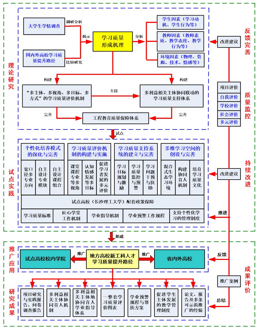 本项目研究将采取联合主持、共同实施、各展优势的方式开展,既有湖南省教育科学研究院从全省层面开展面上探索,更有永利集团88304官网从学校层面和专业层面进行实践耕耘。立足于构建学习质量提升机制,推动新工科由传授范式向学习范式变革,并坚持“以学生学习为中心、以学习效果为中心、以学生发展为中心”,对学习质量进行科学评价,在重构人才培养体系的同时建立起科学的质量评价制度。