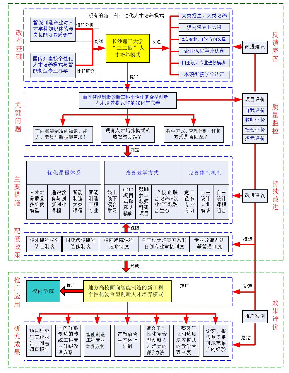 本项目立足制造业转型升级的背景,探索面向智能制造的新工科个性化复合型人才培养模式,认为智能制造等新产业发展本质是新的科技革命导致要素资源的重新配置和生产关系的重新构建,这加速了人才知识结构由单一学科型向多学科复合型发展的转变进程,要求工程科技人才建构符合新产业要求的思维方式,具有工程创新、跨界整合和适应变化的能力,而个性化复合型是培养这些能力的内在要求,也是对新时期工程教育对象学习与思维习惯的响应。
