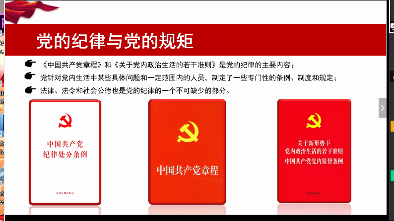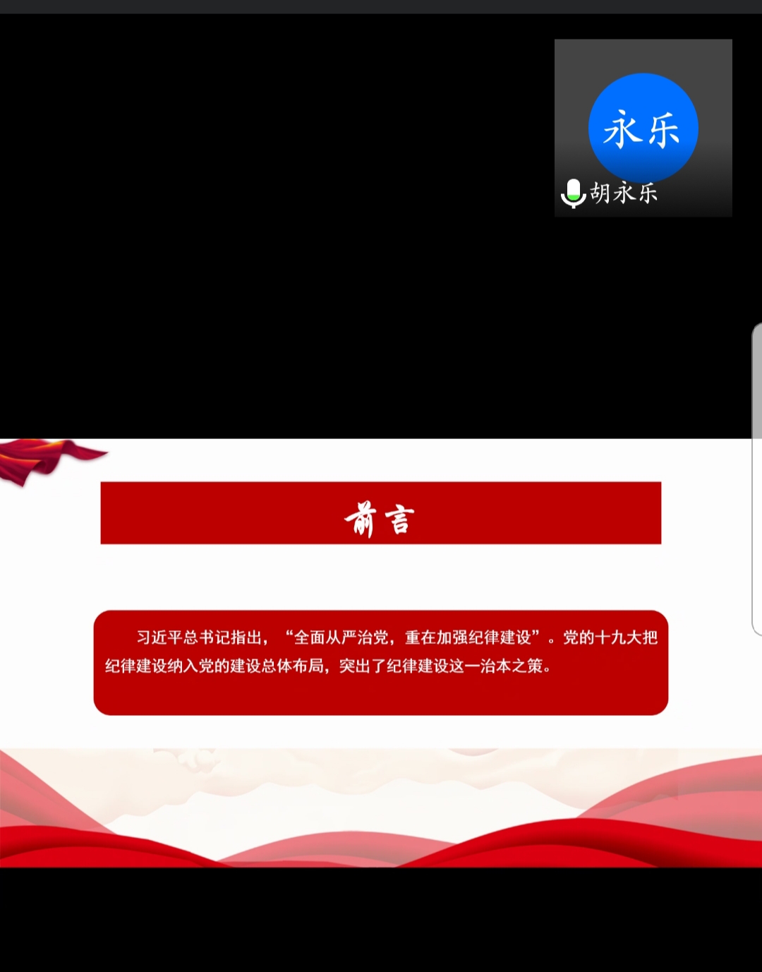 此次培训课以“党的纪律”为主题,胡永乐主要从党的纪律内容、党的纪律处分、党的纪律建设等方面进行讲授。首先,他以习近平总书记提出的“全面从严治党,重在加强纪律建设”引入课程,对党的纪律主要内容进行深入分析,将理论与生活中鲜活的实例相结合,生动形象地阐述了“六大纪律”的具体内容。随后,他详细介绍了党的纪律建设和纪律处分类型,重点强调党在反腐倡廉上的坚定态度。最后,他教导同学们要坚守党的纪律,为党和人民多做贡献,争取早日成为一名合格党员。