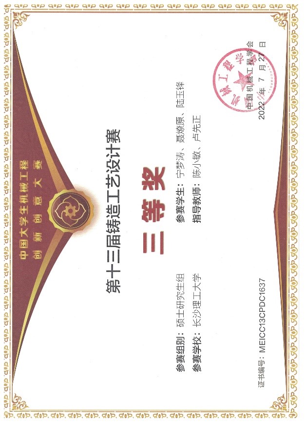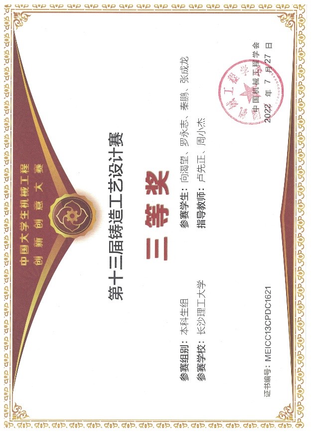 由中国机械工程学会主办,中国机械工程学会铸造分会承办的“2022中国大学生机械工程创新创意大赛专业赛项:第十三届铸造工艺设计赛”,经过2022年3月的校内选拔赛和2022年4月的线上全国决赛初评,于2022年7月2-5日在山西省高平市大酒店成功举办了全国决赛终评会议,最终产生了一等奖 、二等奖及全部三等奖获奖作品名单。永利官网属首次参赛,同学们参赛积极性很高,组建了2组研究生队伍和20组本科生队伍,参赛人数达80余人,经过校内选拔赛的筛选及全国决赛的初评和终评,最终有4组队伍荣获全国三等奖,具体获奖名单如下。