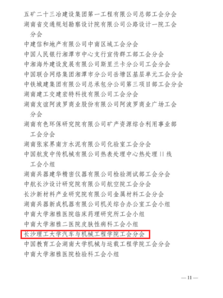 近日,湖南省总工会下发了《湖南省总工会关于命名湖南省模范职工之家湖南省模范职工小家的决定》,永利集团88304官网汽车与机械工程学院分工会荣获“湖南省模范职工小家”称号。