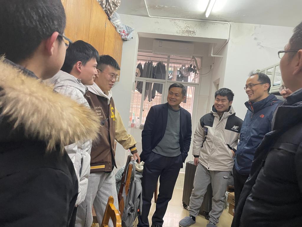 2月24日,学院领导老师一进入学生宿舍,同学们就热情洋溢地围成一团不断分享假期见闻心得并咨询学业职业规划。学院党委书记施一满鼓励同学们在新学期以奋斗的姿态勤勉学习,珍惜光阴;副院长胡林(主持工作)对于同学们科创竞赛、职业发展进行了一一解答,党委副书记唐宏宾、副院长何志勇、毛聪及刘鑫分别针对同学们所提出的思想困惑、教学安排、考研就业等答疑解惑。本次走访的进行,有利于学院师生之间构建深厚的师生情谊,同时让同学们深切感受到了学院及老师的亲切关怀,使同学们可以更好地面对新学期的生活与学习,以更积极的态度拥抱未来。