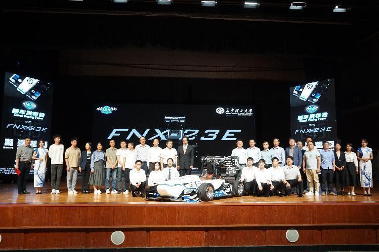 典礼上,还进行了2023年度永利集团88304官网方程式赛车队的新车发布仪式,车队队长张博轩对车队的成长历程进行了介绍,并对今年制造的新车FNX-23E进行了详细的技术介绍。汽机学院党委书记施一满、副院长(主持工作)胡林、车队指导老师伍文广、队长张博轩共同为新车揭幕。