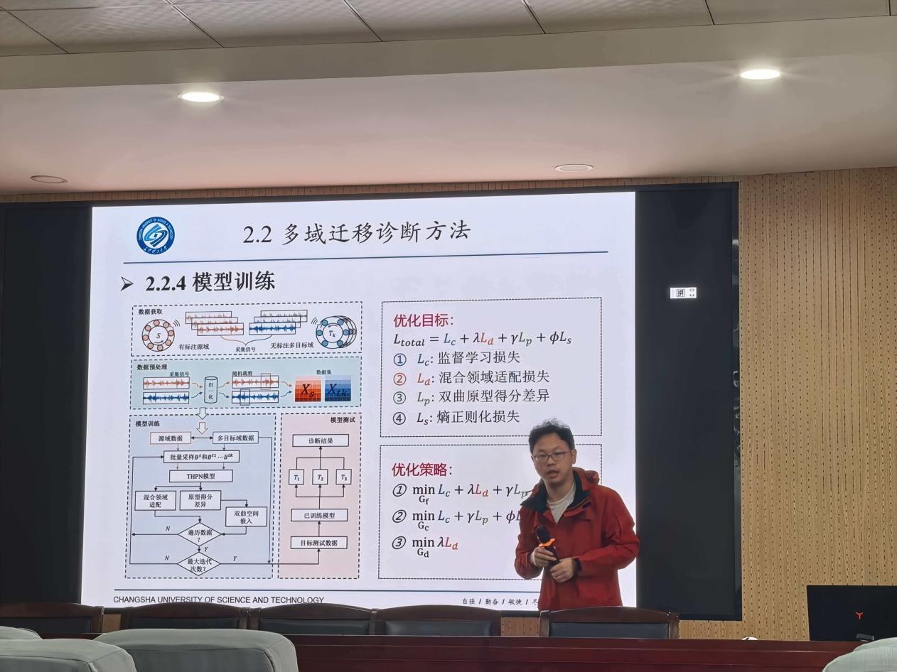在讲座中,唐律博士精彩地展示了题为“面对多目标知识迁移的智能故障诊断”的报告,他详细阐述了多域迁移诊断方法的理论与如何实践,展现了智能故障诊断领域的研究前沿。唐律博士的报告内容丰富,既有理论深度,又有实际应用案例,为在场师生提供极具价值的学术思路与实践参考。