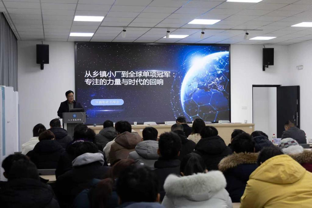 聘任仪式后,石军生教授以《从乡镇小厂到全球单项冠军:专注的力量与时代的回响》为题,为在场师生作专题报告。石教授以电瓷产业在电力系统的关键作用及醴陵产业集群为背景,系统梳理了华鑫电瓷从乡镇小厂到全球单项冠军的四十年发展脉络,重点分享了企业突破特高压技术壁垒、打破国外封锁、研发13.68米GIS瓷套等攻坚故事,诠释了专注坚守、自主创新的精神;讲座尾声凝练提出“选准方向深耕、爱岗敬业专精、树立经营者思维、融入时代洪流”四点感悟,强调个人成长与国家需求结合的价值实现;会后石教授邀请师生赴醴陵及企业实地研学,表达了与高校深化互动、共育人才的积极意愿。