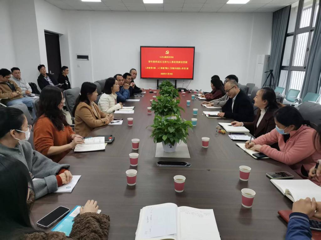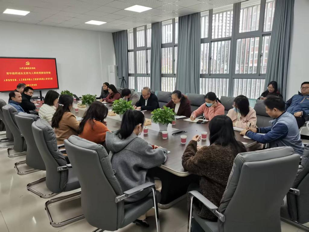 11 18 日下午 人事处党支部与人工智能学院人工智能与机器人系党支部在学院 B203 会议室联合举办青年教师成长支持与人事政策解读答疑主题党日活动。活动以青年教师职业发展需求为导向,通过政策解读、互动答疑、经验分享等形式,为青年教师成长赋能增效。人事处党支部全体党员、人工智能与机器人系党支部党员教师、学院领导及青年教师代表共同参与活动。