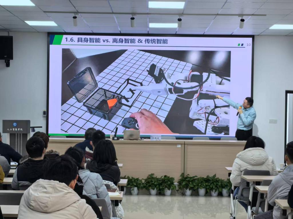 马晓光教授从具身智能的行业发展趋势切入,阐述了从传统智能、离身智能到具身智能的技术演变脉络。聚焦智能机器人、视觉语言导航、低空系统等研究方向,结合自身前沿科研成果与产业实践案例,深入解读了具身智能的技术内核、当前市场格局与高校科研生态,展望了该领域的发展全景与未来机遇。本次学术报告有效拓宽了师生的学术视野学院将继续深化人工智能的跨学科研究,积极推动产学研用深度融合,致力于培养适应未来发展的复合型智能科技人才,为相关产业的高质量发展贡献力量。