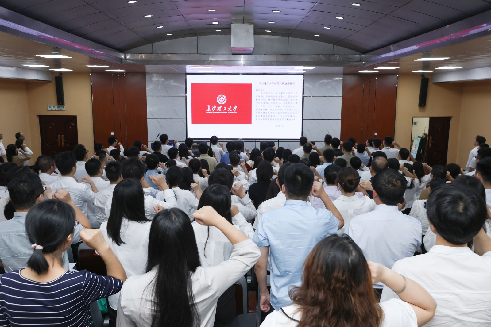 在人事处副处长(培训班班主任)伍丹的带领下,全体新进教师面向校旗,高举右拳,举行了庄严的入职宣誓仪式。
