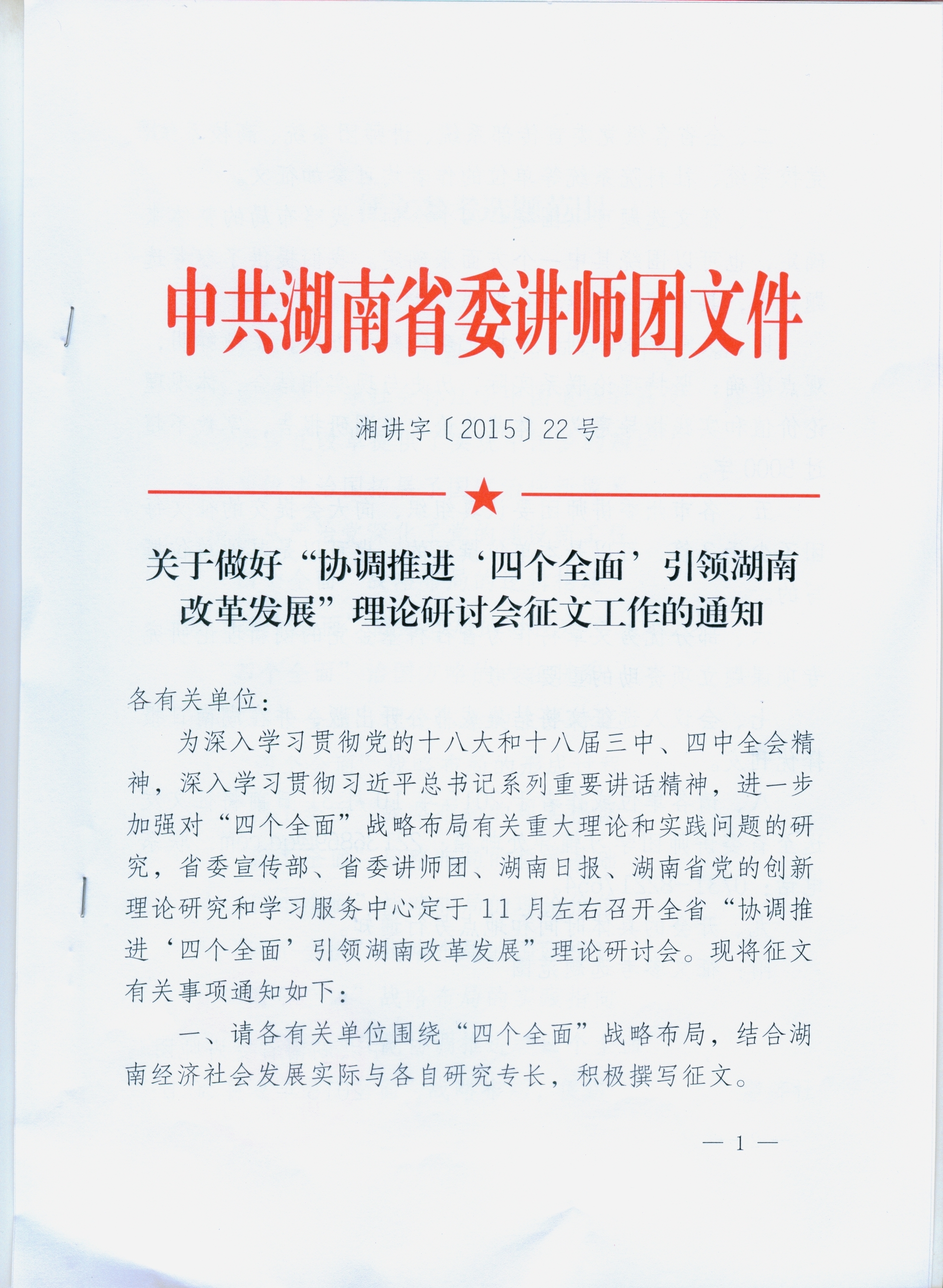 关于做好协调推进“四个全面”引领湖南改革发展理论研讨会征文工作的通知