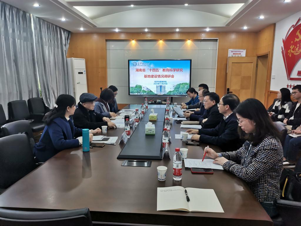 11月20日,湖南省“十四五”教育科学研究基地建设情况调研会在永利官网举行。调研组长原湖南第一师范党委书记彭小奇、省教育科学规划办副主任谢剑虹、校党委副书记、基地负责人刘建民、社科处处长刘建江、经管学院院长彭新宇、基地首席专家黄维及基地成员出席。会议由社科处处长刘建江主持。