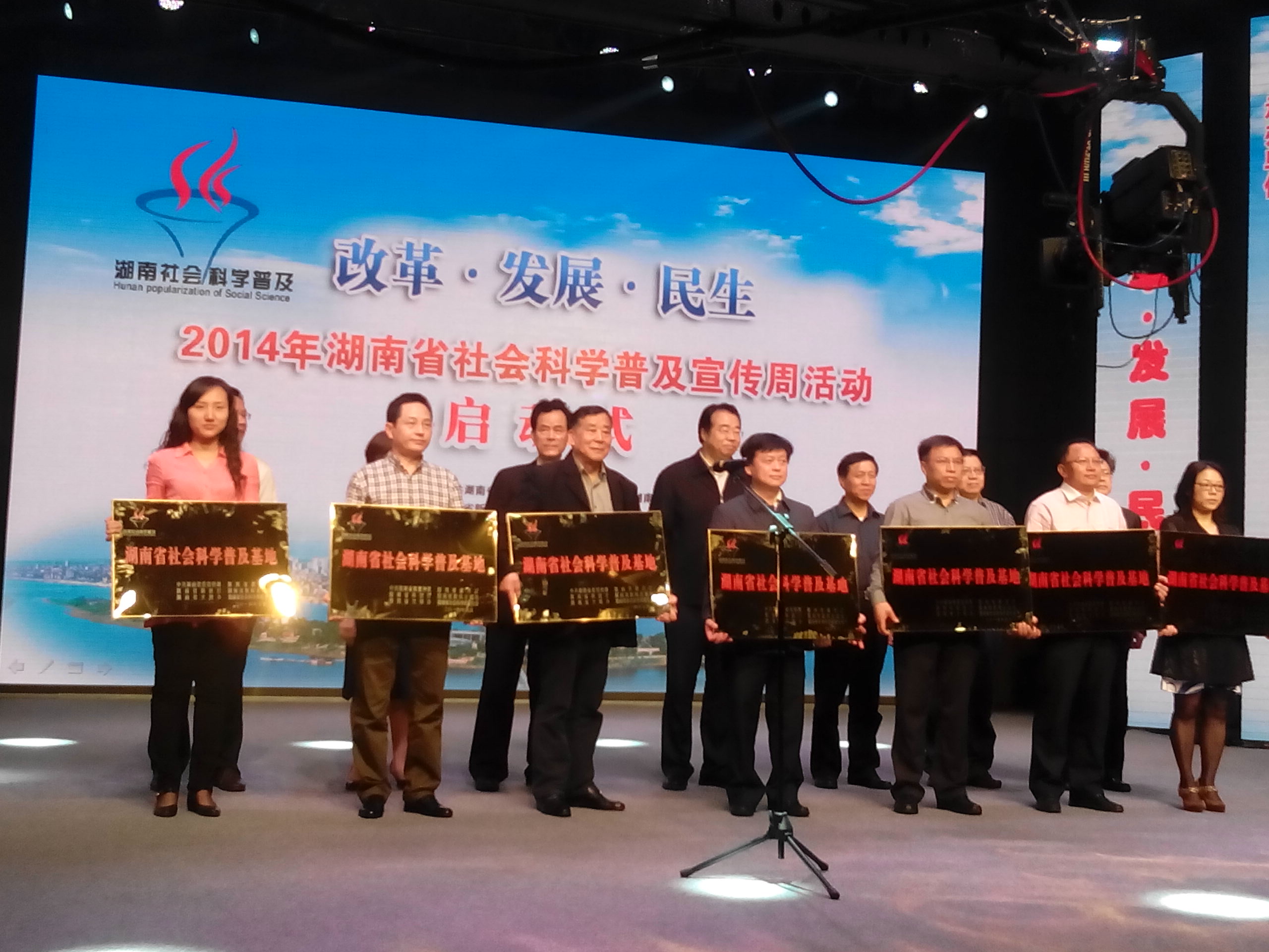 5月19日上午,以“改革•发展•民生”为主题的2014年湖南省社会科学普及宣传周活动启动式暨主题报告会在红网演播中心举行。湖南省委常委、省委宣传部部长、省社科联主席许又声出席,并为第二批湖南省社科普及基地授牌,文法学院院长罗璠、副院长郑劭荣参加了启动仪式,罗璠院长代表永利官网人文素质教育中心上台接受授牌。在随后举行的“湖湘大学堂·名家讲坛”主题报告会上,十八届中央委员、中央社会主义学院党组书记、第一副院长叶小文作“中国的新一轮改革”主题报告。