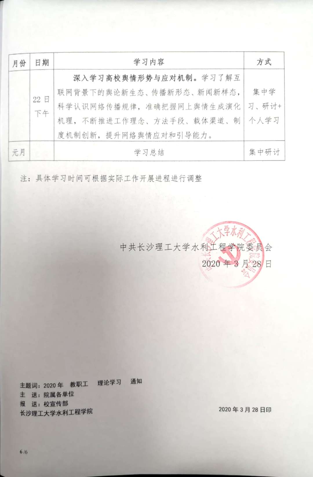 水利工程学院关于2020年教职工理论学习安排的通知(长理工大水利党【2020】02号)