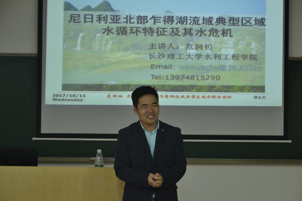 2017年10月11日下午,水利学院“学术沙龙”活动2017年第10期在云塘校区工三B319举行。我院青年教师危润初博士作主题为“尼日利亚乍得湖盆地水循环特征及其水资源危机”。报告由李志威副研究员主持,我院教师李梦成、黄草、陈龙及20余名本科生、研究生参加了本次学术讲座。