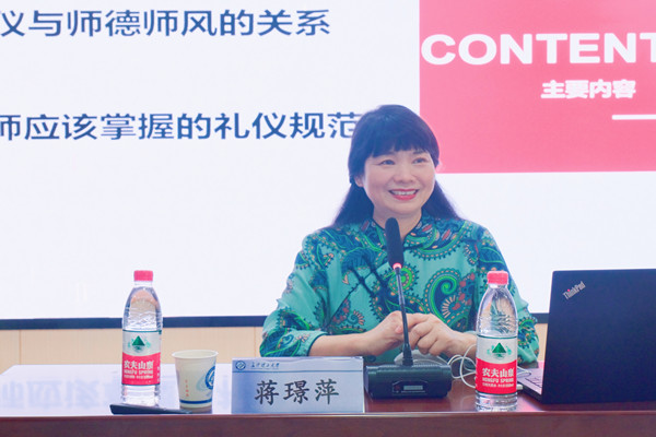 蒋璟萍主要从礼仪与师德师风的关系、教师应该掌握的礼仪规范两个方面向大家做了系统的梳理。她从“礼仪”一词的古代与现代意蕴着手,阐述了什么是教师的礼仪规范;礼仪是小节也是大德、是外表也是内养;并用习近平总书记关于师德师风建设的重要讲话论述了礼仪在师德师风建设中的重要作用,她认为好老师就是从细节着手“教人求真”。蒋璟萍还详细分析了教师在言行、仪容、服饰、体姿等各方面的礼仪规范。她告诫所有教师,要“在循礼中彰显师德师风,择善而从、博学于文、约之以理。”