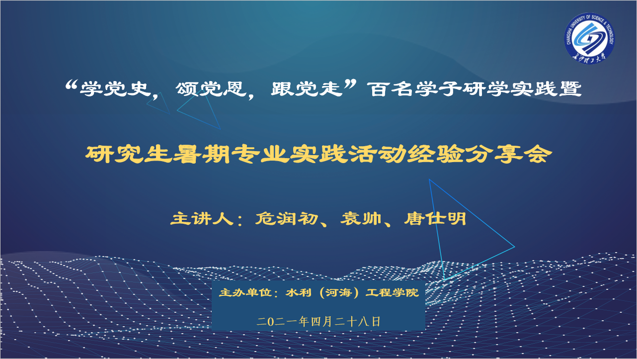 4月28日晚上7:00,水利工程学院在工三B446举行了“学党史,颂党恩,跟党走”百名学子研学实践暨研究生暑期专业实践活动经验分享会。本次交流会由学院水文系专业教师危润初、往期暑期专业实践活动获奖团队代表19级博士生袁帅、18级硕士生唐仕明担任主讲,研究生辅导员綦丽、部分研究生和本科生参加了此次活动。会议由20级班长杨恩喆主持。