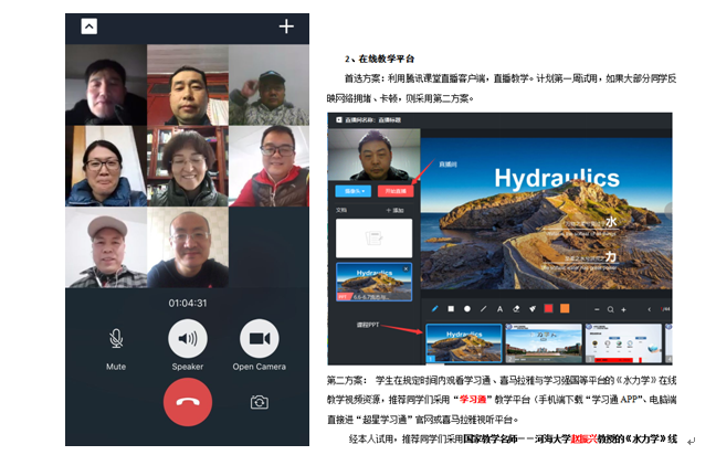 为保障疫情防控期间学院本科教学工作的顺利进行,全面贯彻落实“抗疫情,停课不停教,停课不停学、质量不降低”的要求,学院党政高度重视线上教学工作,通过领导工作群和党政联席会视频会议,研究和部署春季学期线上教学工作。学院制定疫情期间本科线上教学工作方案,做到“教学有方案,组织有安排,质量有保障”。水利工程学院专业老师多措并举,实施线上教学,师生“云端”相聚,广大师生克服困难、精神饱满,承载着梦想和希望,网络的两端师生不曾分离,学院线上教学平稳有序开展。