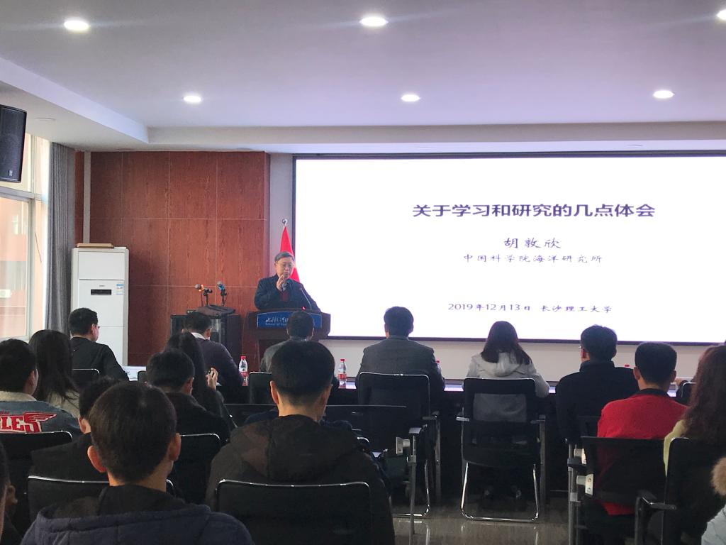 12月13日上午,水利工程学院研究生博力论坛第五场在工三B319举行。会议由水利工程学院院长胡旭跃主持,中科院海洋所胡敦欣院士受邀参加此次讲座,党委书记喻玲娜、学院副院长陈杰、程永舟,实验室主任姚宇和17、18级全体研究生参与本次学术报告。