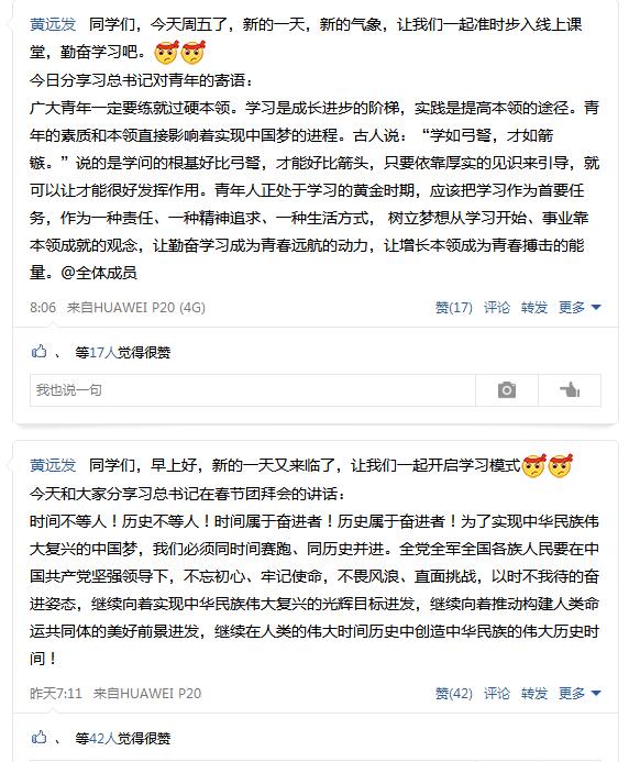 辅导员黄远发老师每天在课前通过分享学习名言督促学生按时上课,进驻课堂听课看课查课,联合学委了解学生上课及出勤情况,对缺课同学及时联系、掌握动态,多次将睡过头、开小差和旷课的同学拉回课堂。甯子豪老师注重课后带动,通过带领学生每日进行学习打卡,发动学委积极组建学习帮扶小组、分享学习笔记,帮助学生巩固学习成果。