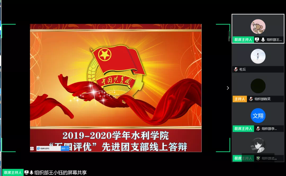 为加强我院共青团工作和建设,增强团员队伍的先进性,充分发挥优秀模范示范引领作用,4月11日晚7点半水利工程学院在腾讯会议上举行2019-2020学年“五四评优”先进团支部答辩。担任答辩的评委有院学生辅导员肖苹宁、杜丘、邓奕琳、黄远发以及甯子豪,会议由王小钰和康子怡进行主持。