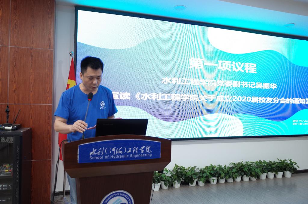 大会伊始,吴振华宣读了《水利工程学院关于成立2020届校友分会的通知》和校友分会理事会名单,希望校友分会成员要培养和增强校友的母校意识、母院意识,加强与各届、各地校友的联络,增强校友分会工作影响力,调动各方面校友工作积极性,努力做好校友工作。