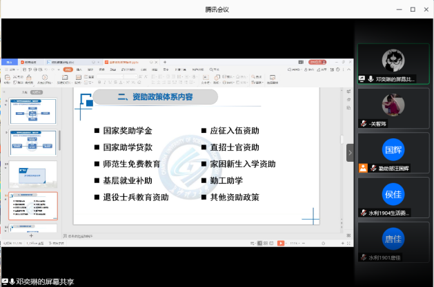 2020年6月8号晚,水利工程学院勤助部通过腾讯软件召开会议,布置了“诚信月”系列主题活动,并介绍了国家资助政策。本次会议由勤助部干事汪国辉主持,资助工作辅导员邓奕琳,勤助部全体成员以及2019级全体生活委员及班长参与。