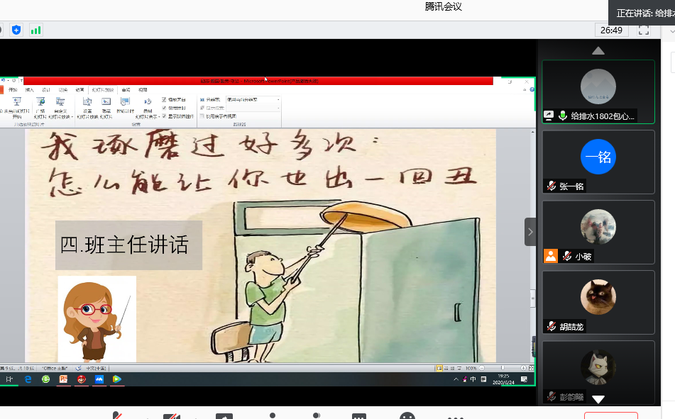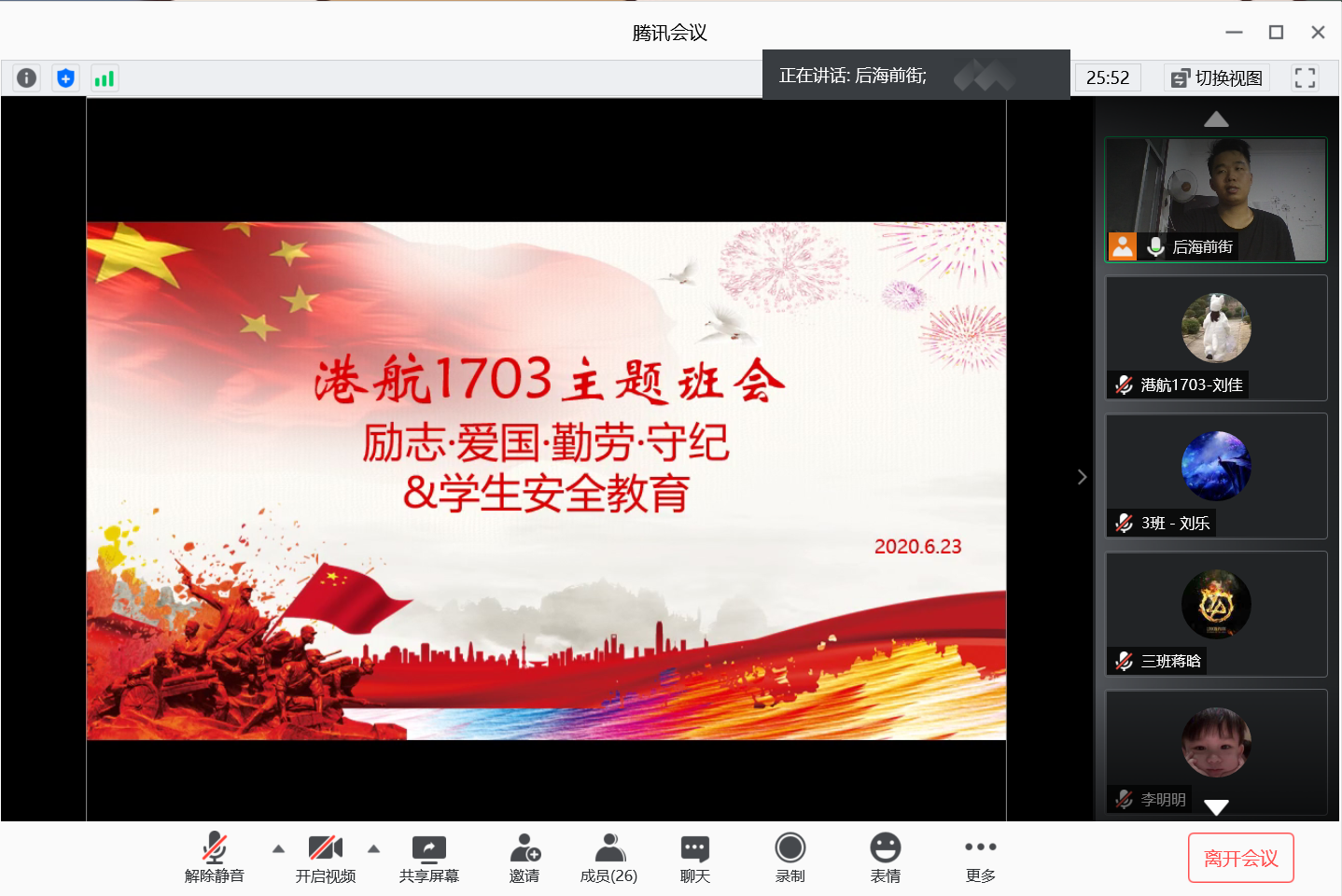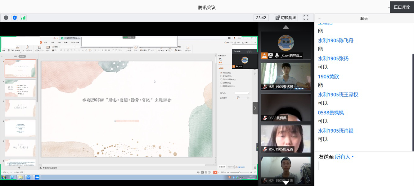 为加强端午期间学生安全教育管理以及做好疫情期间学生思想政治教育工作。6月23日和6月24日,水利工程学院所有非毕业本科生班级通过腾讯会议召开了“励志·爱国·勤劳·守纪”主题班会,共计38个班。根据学院统一部署,班会由各班班长主持,各班班主任和辅导员参加班会。