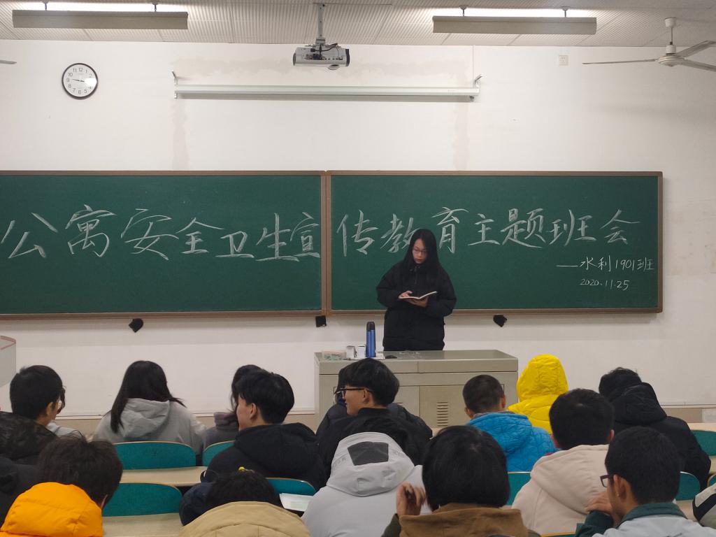 为进一步增强学生安全防范意识,加强学生公寓消防安全工作,杜绝各类安全事故发生,给学生营造安全舒适的学习生活环境。2020年11月24日至11月28日,水利工程学院各班级召开了宿舍卫生安全教育主题班会,班会由各班长主持。