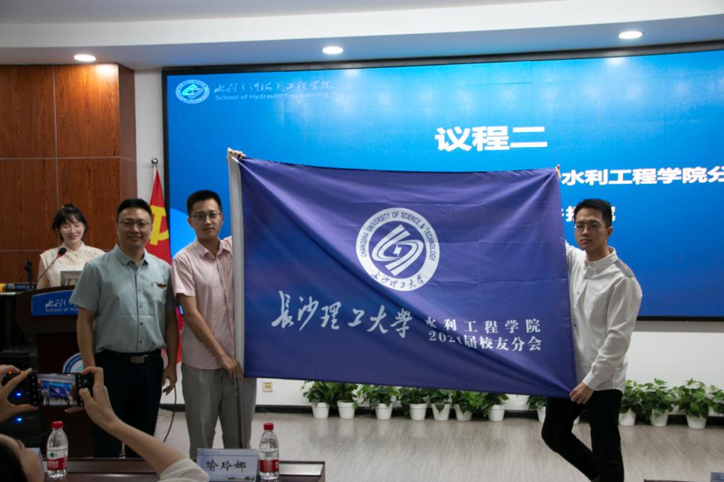 王任飞为校友分会理事会成员颁发聘书并授旗,在讲话中肯定了学院近年来的校友工作,对2021届水利学院校友分会的成立表示祝贺,希望广大水利校友秉承优良传统,发挥桥梁纽带作用,与学校共同成长、共同发展,努力推动校友和母校事业的共同发展,在各自工作岗位上创造辉煌。
