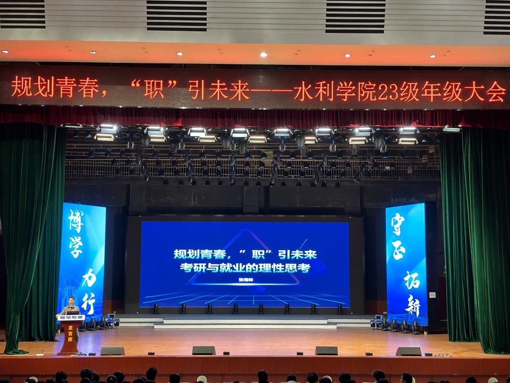 为助力2023级学生明确发展方向,科学规划大学生涯,11月28日晚,水利学院于云塘大会堂举办了以“规划青春·‘职’引未来”为主题的2023级学生年级大会。学院党委副书记银波、年级辅导员张海林以及全体2023级学生参会,会议由年级辅导员黄婷主持。