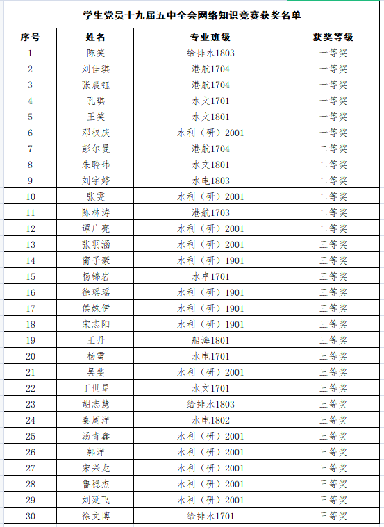 为贯彻学习党的十九届五中全会精神,引领我院学生党员进一步坚定中国特色社会主义理想信念,强化责任意识与担当精神,2020年12月,中共永利集团88304官网水利工程学院学生总支部委员会组织了党的十九届五中全会网络知识竞赛。根据竞赛成绩,陈笑等6名同志获一等奖,彭尔曼等6名同志获二等奖,张羽涵等18名同志获三等奖。现将获奖名单公示如下,希望各学生支部党员能再接再厉,增强学习自觉,不断提高思想理论水平,做忠诚干净担当的合格党员。