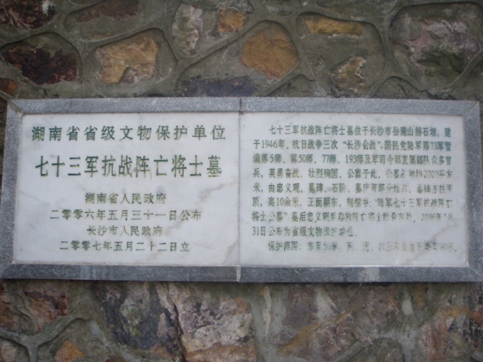 七十三军抗战阵亡将士墓是1946年为纪念在抗日战争第三次“长沙会战”中英勇奋战、壮烈殉国的陆军第七十三军将士而建立的,属省级文物保护单位。大家怀着对英雄们无比崇高的敬意立正向墓碑鞠躬、默哀一分钟,并围绕墓碑缅怀革命先烈。