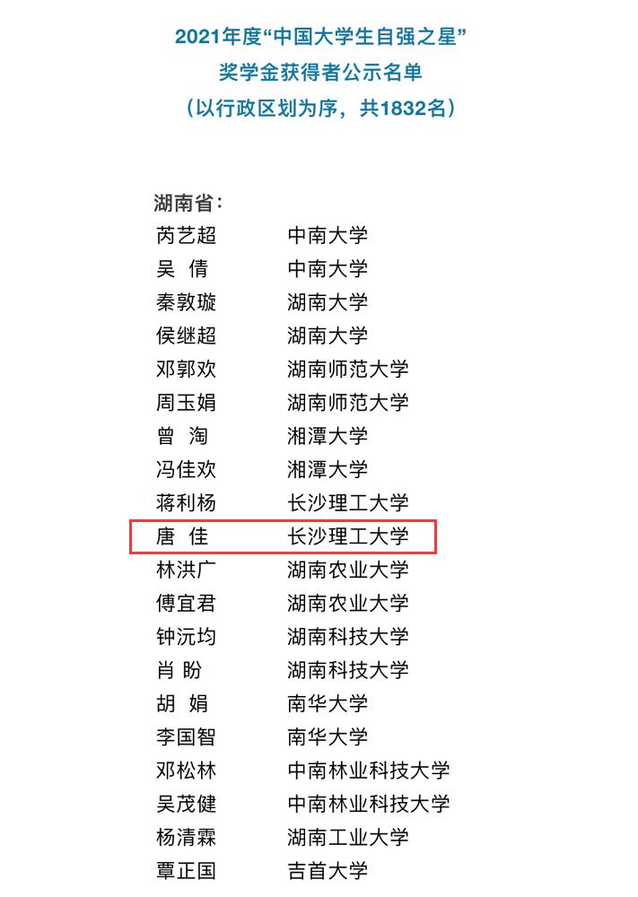 近日,2021年度“中国大学生自强之星”奖学金名单揭晓。经个人申请、高校推荐、省级初评、全国评审等环节,共评出“中国大学生自强之星标兵”奖学金获得者10名、“中国大学生自强之星”奖学金获得者1832名。我院水利水电工程专业2019级本科生唐佳荣获2021年度“中国大学生自强之星”荣誉称号。