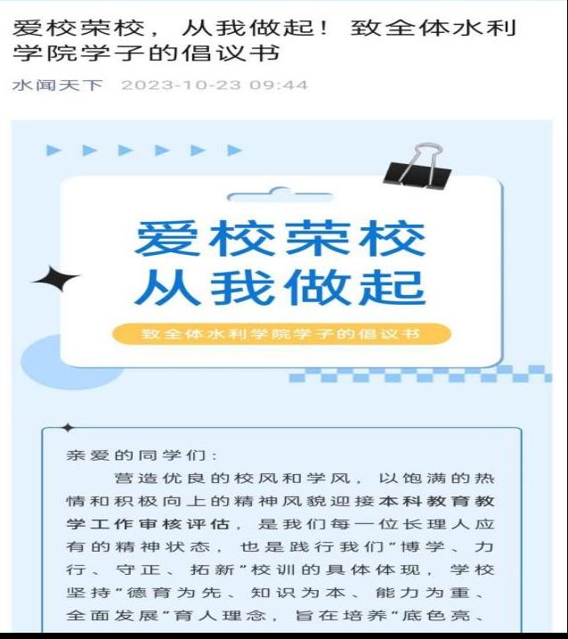 三、广泛动员,强化意识,多渠道做好本科教育教学评估的宣传。通过学院官网、微信公众号、水利学工等新媒体平台多种渠道,加强对本科教育教学学习成果的宣传,形成良好的舆论氛围。坚持理论学习常态化,发布“爱校荣校”倡议书,引导全院青年学生主动关注本科教育教学,全方位了解学院的人才培养定位,教育教学的具体举措和育人成效,营造浓厚的氛围。