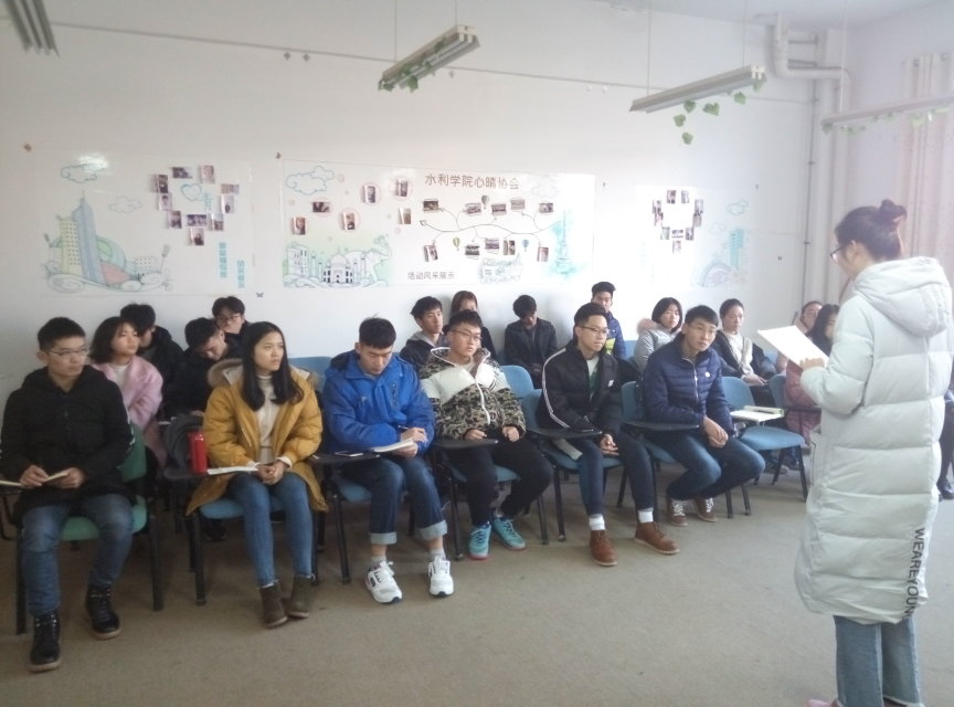2018年1月9日,水利工程学院心晴协会于工科三号楼A345召开2017年下学期工作总结大会。会长王英琪主持本次会议,刘灿老师及心晴所有成员参与本次会议。