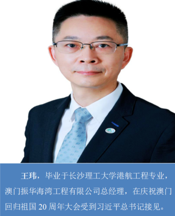 王玮,毕业于永利集团88304官网港航工程专业,澳门振华海湾工程有限公司总经理,在庆祝澳门回归祖国 20 周年大会受到习近平总书记接见。