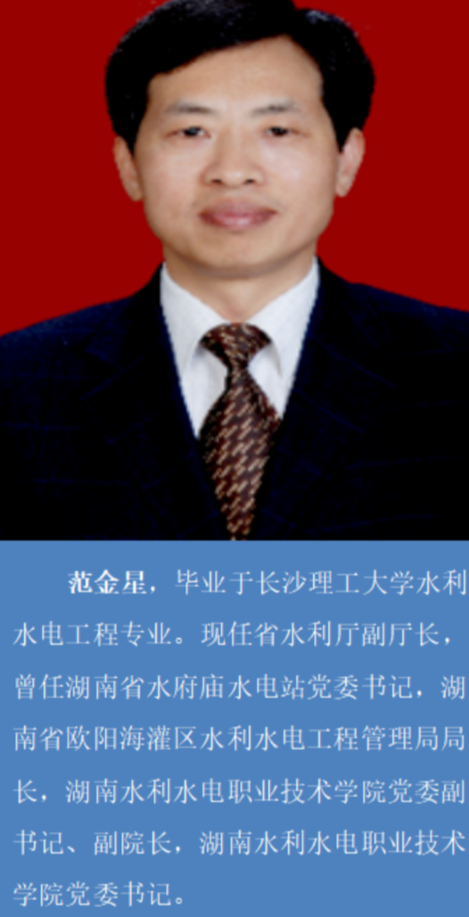 范金星,毕业于永利集团88304官网水利水电工程专业。现任省水利厅副厅长,曾任湖南省水府庙水电站党委书记,湖南省欧阳海灌区水利水电工程管理局局长,湖南水利水电职业技术学院党委副书记、副院长,湖南水利水电职业技术