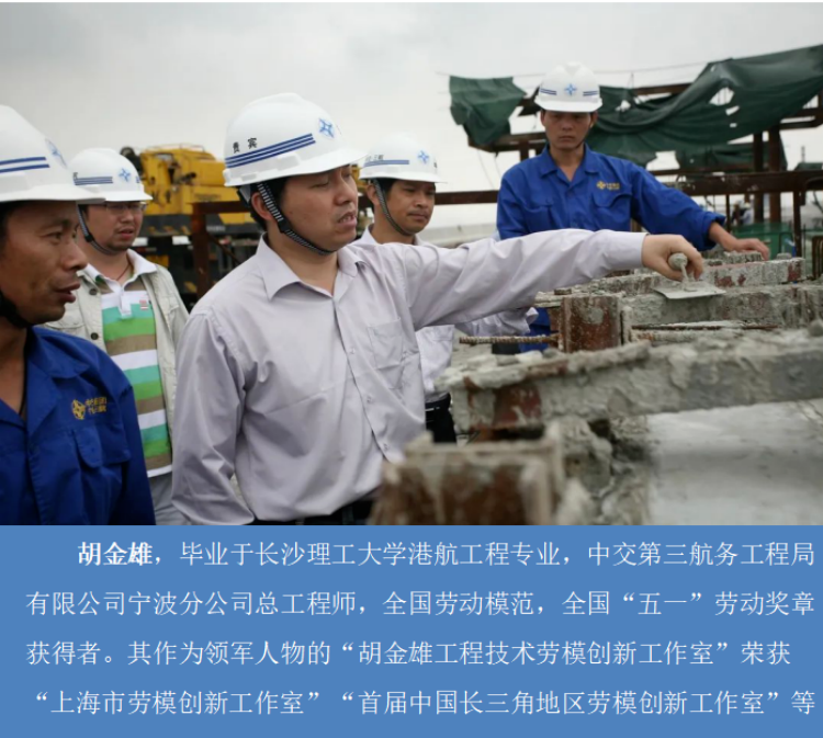 胡金雄,毕业于永利集团88304官网港航工程专业,中交第三航务工程局有限公司宁波分公司总工程师,全国劳动模范,全国“五一”劳动奖章获得者。其作为领军人物的“胡金雄工程技术劳模创新工作室”荣获“上海市劳模创新工作室”“首届中国长三角地区劳模创新工作室”等