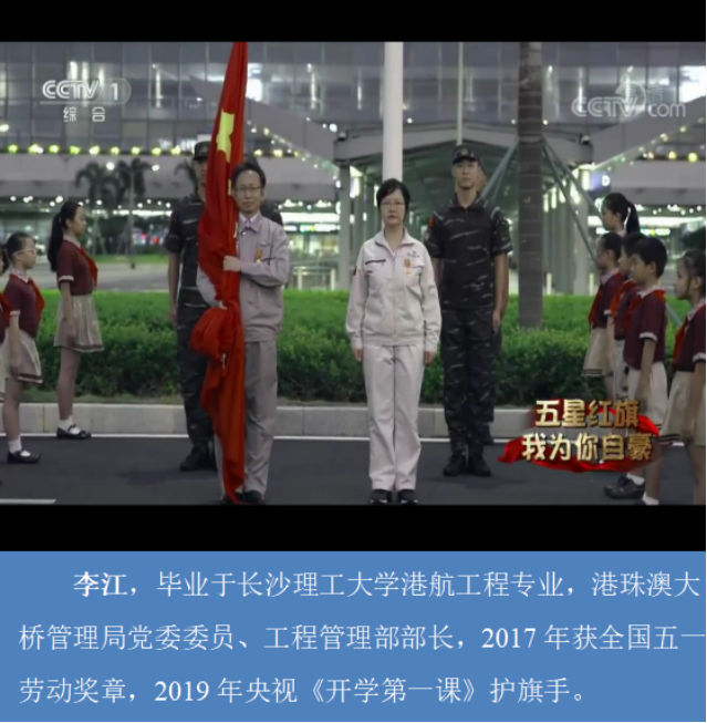 李江,毕业于永利集团88304官网港航工程专业,港珠澳大桥管理局党委委员、工程管理部部长,2017 年获全国五劳动奖章,2019 年央视《开学第一课》护旗手