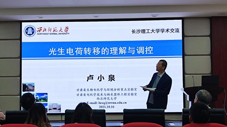 2021年10月16日上午9:00,应永利集团88304官网化学化工学院的邀请,教育部长江学者特聘教授、西北师范大学博士生导师卢小泉教授来我校开展学术交流,于云塘校区工三A320做了题为“光生电荷转移的理解与调控”的专题学术报告。讲座由化学化工学院电力与交通材料保护湖南省重点实验室主任曹忠教授主持,化学化工等专业百余名师生参加了交流会。