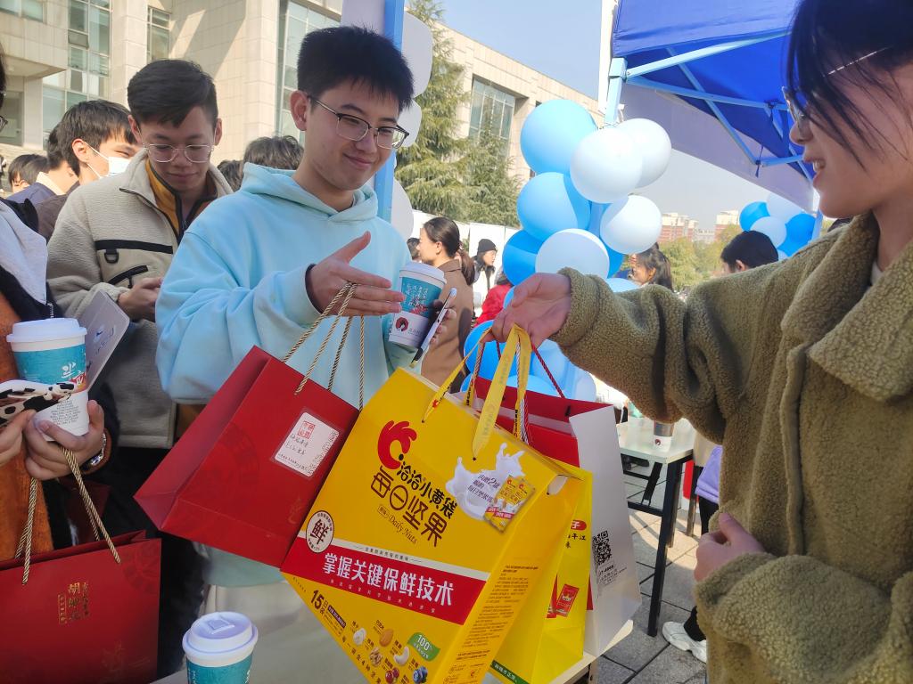 活动现场,用人单位招聘简章整齐排列,在“集齐七家用人单位考研祝福召唤大礼包”环节,考研学子在学生干部手中依次领取用人单位招聘简章,扫码发送“专业+姓名”添加用人单位微信,用人单位负责人通过微信远程送上考研“云”祝福。集齐七家用人单位考研祝福的考研学子,即可领取一份由食品行业用人单位产品组成的零食大礼包,祝福考研学子心想事成,考研上岸。在等待回复的间隙,考研学子还可以参与“解压爆爆”抽奖环节,舒缓考研紧张情绪的同时抽取生物行业用人单位提供的丰厚纪念品。此外,考研学子还可以在班主任、学生支部党员、辅导员老师处分别领取到为专业课复习保驾护航的“专业课辅导包”、包含往届考取各院校热心学长学姐联系信息和鼓励的“复试指导包”以及做好疫情防护必须的“防疫物资包”,为专业课复习、复试及考试防疫做准备。