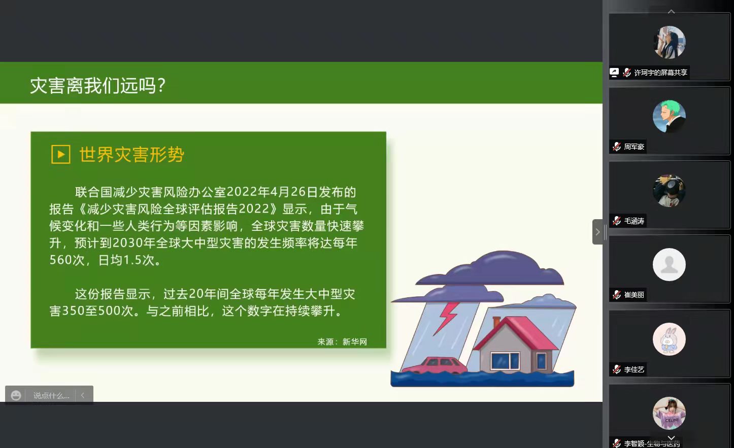 学生代表许珂宇从预防雷电火灾、滑坡地震、洪涝灾害等方面进行了减灾防灾知识宣传,她呼吁同学们树立灾害防范意识,减少各类灾害发生,学会应对灾害的自救技能。