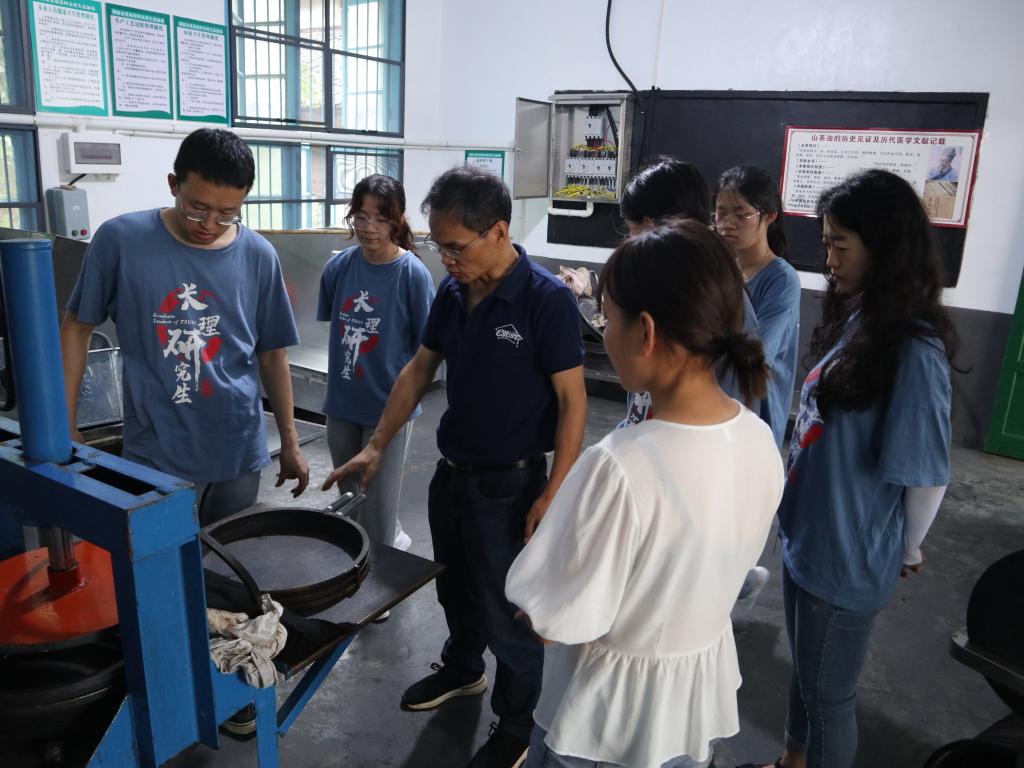 随后,实践团成员自行探索生产设备的结构和工作原理,化身工艺讲解员。实践团成员食品2003班蒋明芳在介绍蒸胚机时说:“这个蒸胚机的结构体现了设计人员的三个智慧,一个是桶中的不锈钢网做成半球形是为了增大受热面积和传热效果,第二个是不锈钢隔板的设计是为了防止液态水分进入原料中,第三个是水箱中的浮球,是为了控制蒸胚机中水位的高度。”大家都对这些微小但是重要的设计赞不绝口。在指导老师吴苏喜教授的指导和协助下,实践团将油茶籽倒入粉碎机粉碎,在蒸胚机里蒸熟,然后转移到制饼机将初油挤压出来。在看到金灿灿的茶油从制饼机溢出来时,每个人的成就感油然而生,然后将油装瓶,以便后期将油带回学校实验室,进行质量指标检测和后期离心去杂工艺处理。