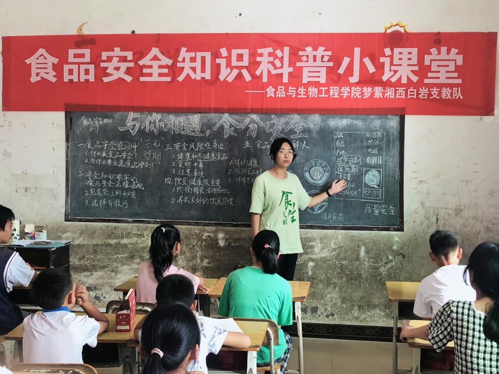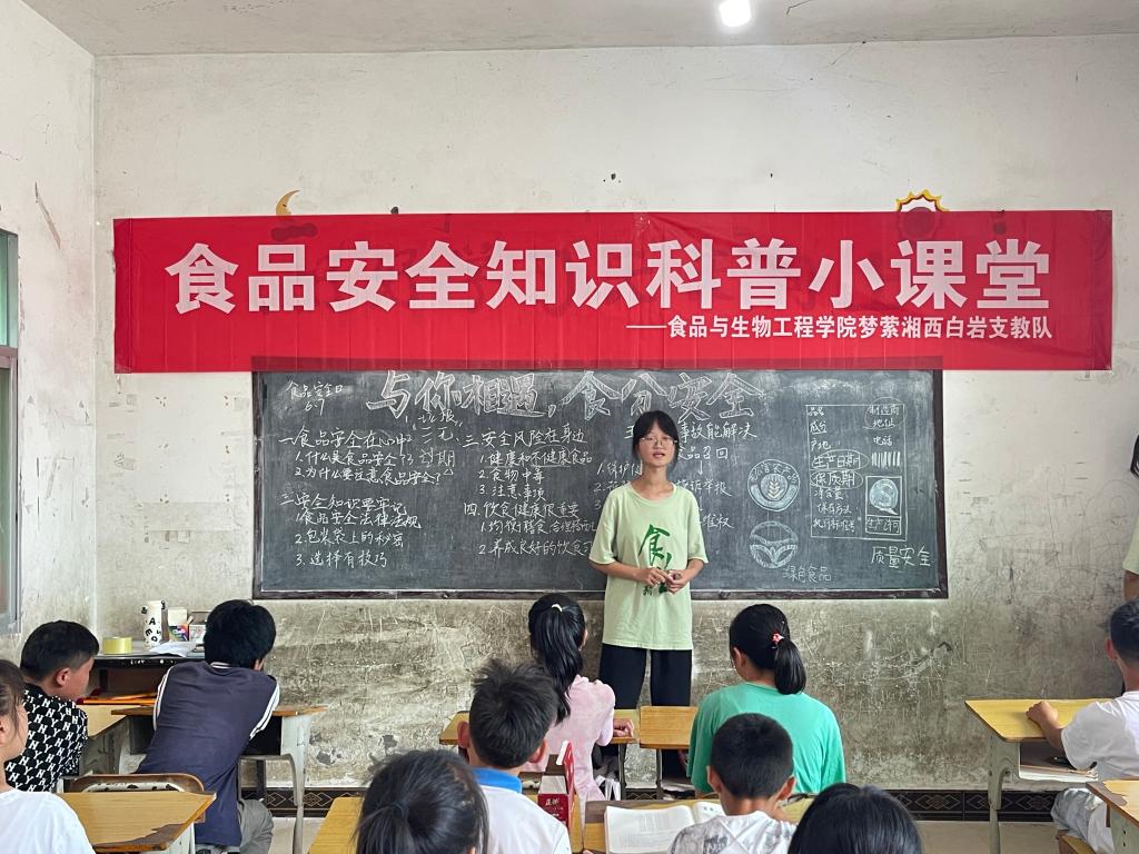 7月11日上午 ,永利集团88304官网食品与生物工程学院“梦莹湘西”支教队暑期“三下乡”社会实践团深入白岩村,开展“与你相遇,‘食’分安全”食品安全知识科普小课堂,为学生们奉上一堂内容丰富、生动鲜活的“食安课”。