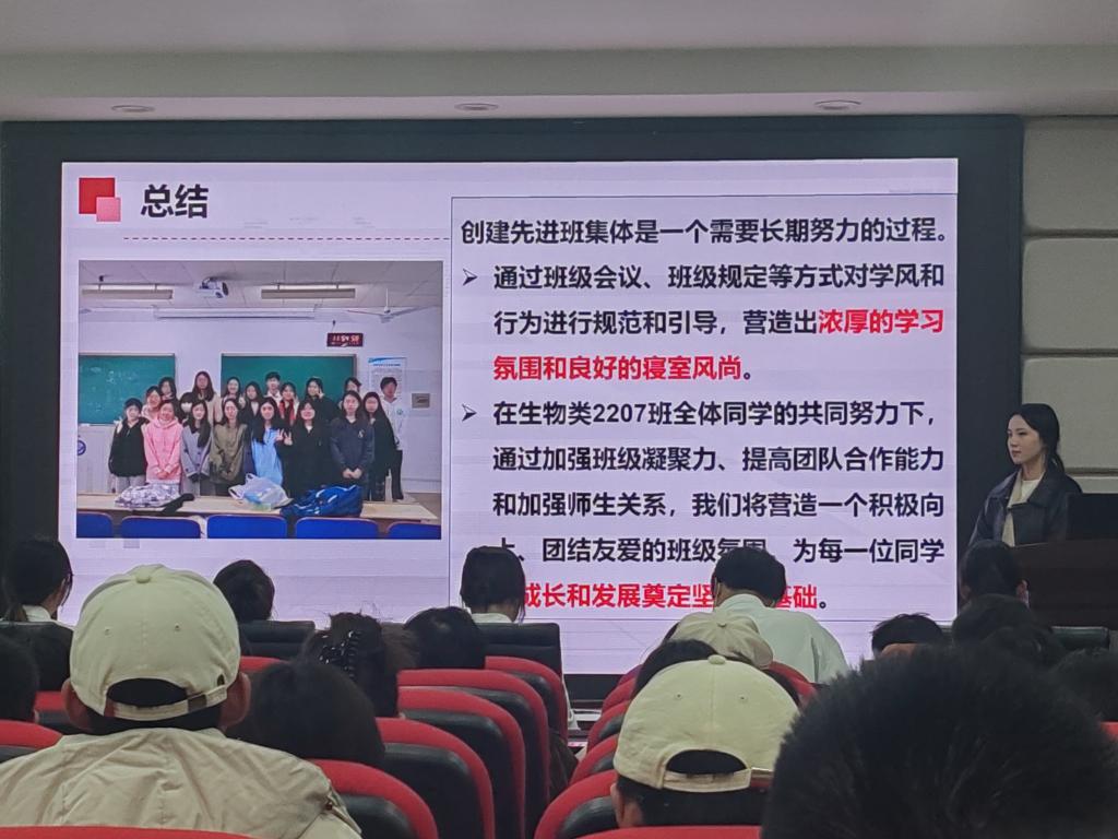 本次“先进班集体”结项项共有来自20、21、22级的8个班级参加答辩会。各班就班风建设、学风建设、寝室文明建设、班级获奖成果等方面展示本班上一学期的发展与成果。汇报过程中,各班代表的讲述条理清晰、详略得当,辅以精美的PPT内容,力争在有限的时间内将班级风貌充分彰显出来。