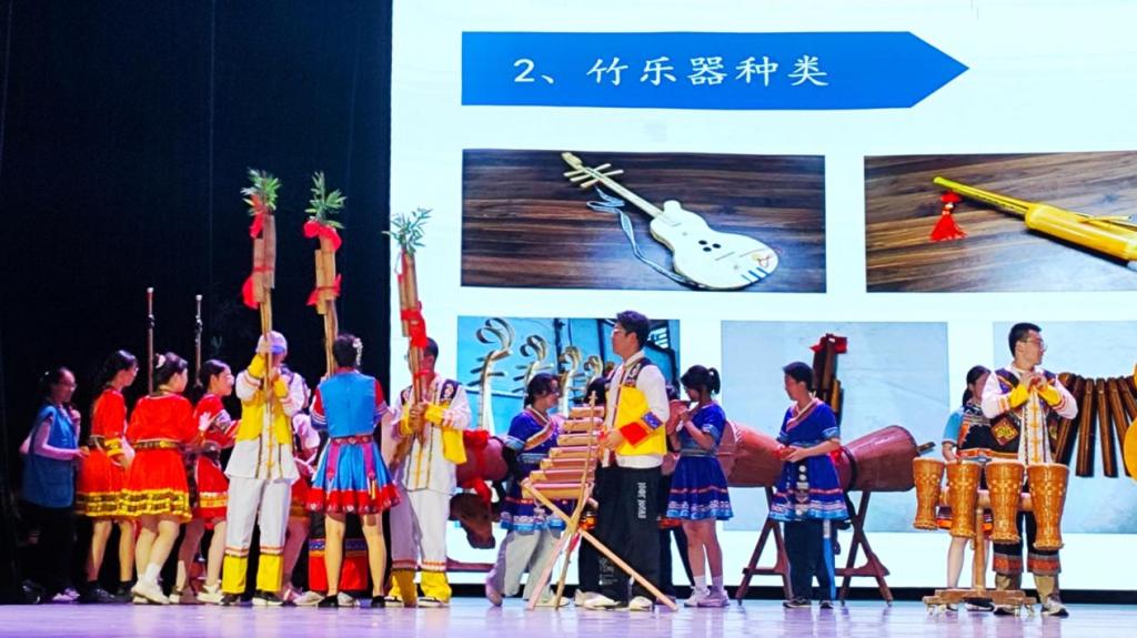 此外,食安兴农团还采访了黄金瑶族乡文化站原站长、湖南省级非物质文化遗产“崀山峒歌”代表性传承人陈孝友。通过采访,食安兴农团成员们了解了当地非物质文化遗产传承情况以及瑶族竹制乐器的相关知识。采访之后,大家又以助教的身份参与到人数达九百余人的瑶族文化科普课堂--竹制乐器--教学互动环节,沉浸式感受了崀山峒歌和瑶族传统竹制乐器的魅力。