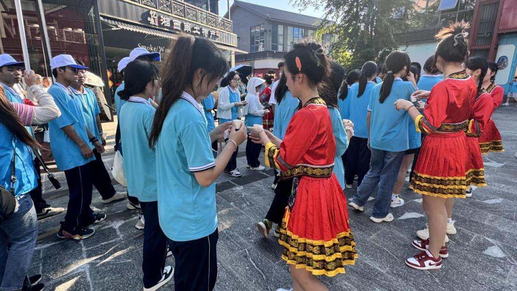 “世上的米酒呀,万万千!哪有瑶山呀,美酒甜!手捧竹铜壶,喝一口!留在心窝噻,甜三年!喝!喝!”--这是著名的花瑶拦门酒歌,“拦门酒”是瑶族用米酒欢迎贵客的习俗。食安兴农团成员们身着瑶族传统服饰,以茶代酒欢迎学子们的到来。通过沉浸式参与花瑶“拦门酒”文化活动,食安兴农团成员们在亲自感受了瑶族热情好客的传统文化,同时让更多青年学子认识了中华民族绚丽多彩的文化瑰宝,增强了文化认同感和民族自信心。