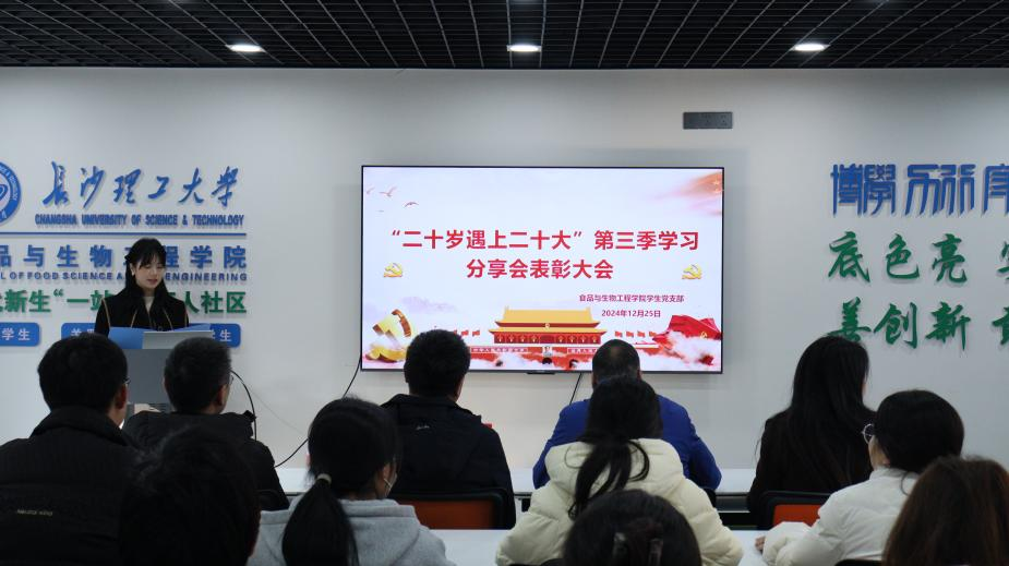 近期,食品学院学生党支部在一站式育人社区开展了“二十岁遇上二十大”第三季学习分享表彰大会。院党委书记高顺利、副书记练黎旋、专职组织员彭玉楼、学工办老师胡佳佳及学生代表50余人出席本次活动。