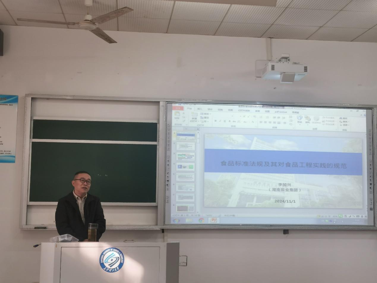 为拓宽学生的专业视野,提升学生对食品行业的认知水平,增强安全意识,引导学生树立专业认同感和职业责任感,为职业发展和未来就业奠定坚实的基础,2024年11月1日,我院邀请了永利集团88304官网优秀校友、湖南省轻工盐业集团有限公司(简称“盐业集团”)技术中心原首席专家李加兴教授为正在进行认识实习的22级食品科学与工程专业学生做“食品标准法规及其对食品工程实践的规范”专题讲座。本次讲座由学院教授委员会主任易翠平教授主持,22级食品科学与工程专业120多名学生参会。