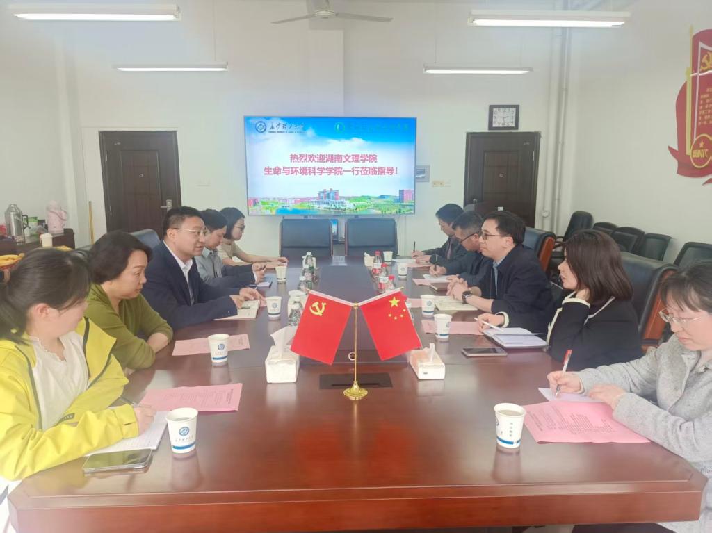 4月24日下午,湖南文理学院生命与环境科学学院党委副书记贺江一行5人来院调研。学院党委书记高顺利在云塘校区工科三号楼A329会议室会见客人。相关院领导、系主任和教授参加会谈。