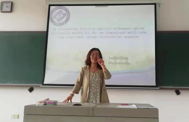 乔博士详细讲解了分数阶方程的研究背景及意义、如何构造高效的数值格式、怎样进行理论分析、如何进行数值计算等内容,就报告中的创新点,提出了一类新的时间分数阶积分微分方程,并给出了将交替方向法用于求解此类方程的思路。乔博士与同学们进行了有效的互动交流,回答了同学们提出的问题。